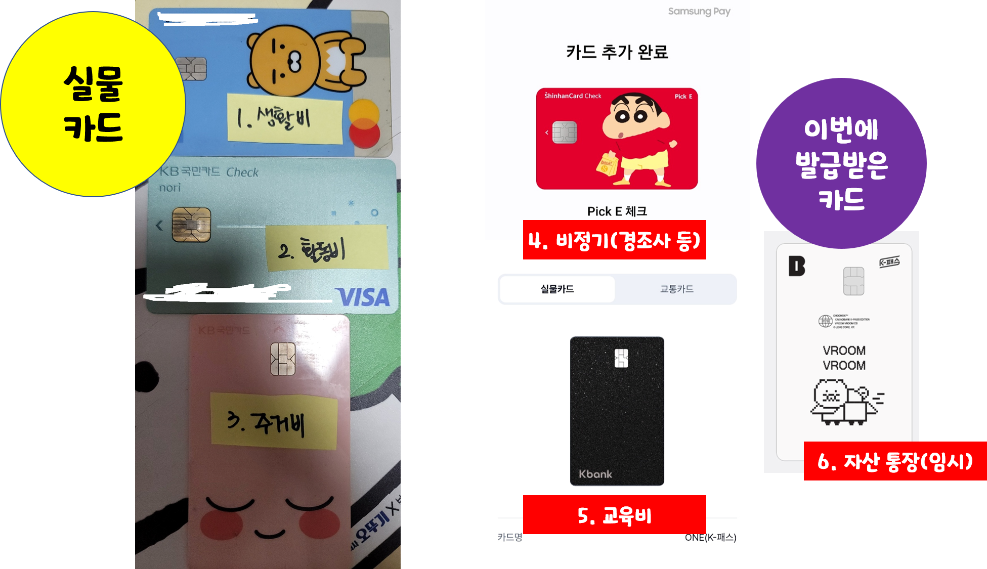 과제를 수행하면서 내가 뭔가를 시도하고 있는 느낌, 도전하고 있는 느낌이 들어서 좋았다. 통장 쪼개기와 지출 통제를 위해서 기존에 가지고만 있던 많은 은행의 통장들에 체크카드들을 신청했다. 기왕이면 좋아하는 캐릭터가 있는 체크카드를 쓰면 좋을 것 같아서 '짱구' 체크카드도 신청했다.